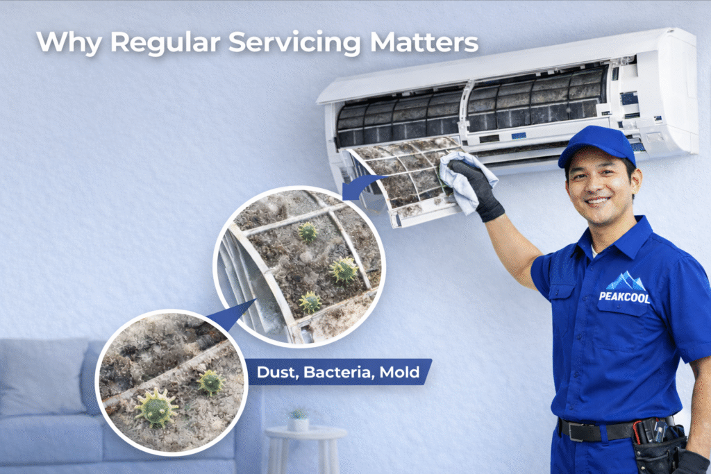 Your air conditioner does more than just cool — it filters, circulates, and maintains the quality of air in your space. Over time, without proper maintenance, it can accumulate dust, bacteria, and Mold. This leads to: